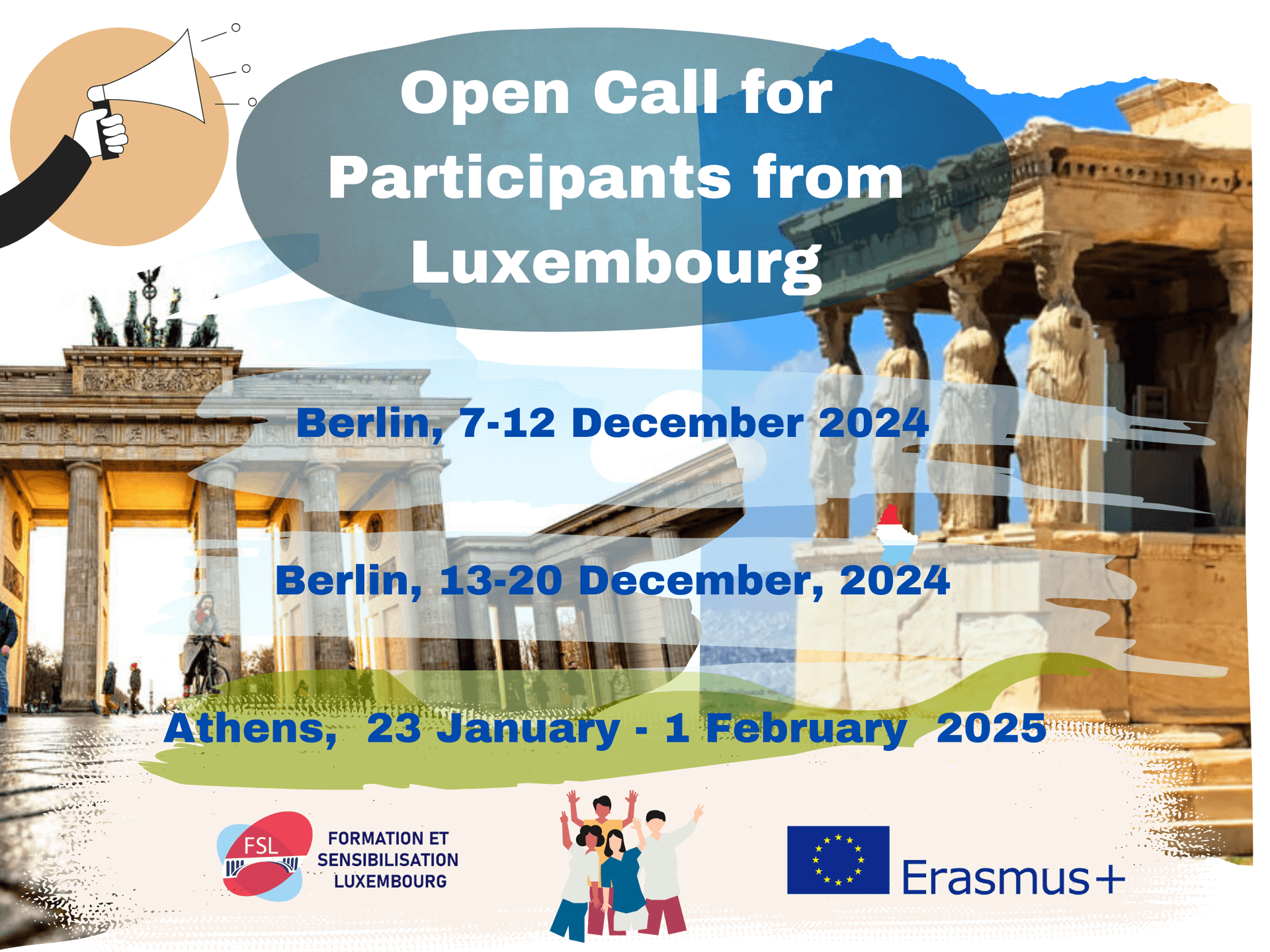 Four international training opportunities for Luxembourg youth workers: preventing radicalization in Georgia, volunteering empowerment in Berlin, refugee support in Berlin, and media literacy youth exchange in Athens.